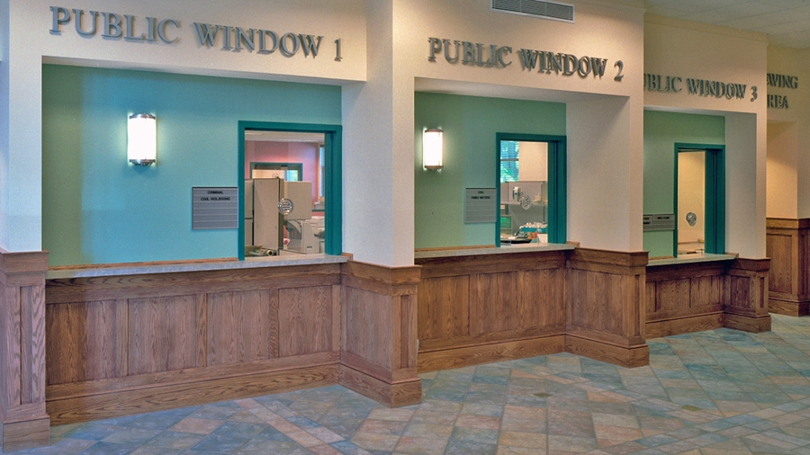 The new courthouse site is on the edge of the campus, with frontage on Main Street. It is adjacent to the newly expanded public library, and ample parking is available in the redesigned campus lots behind it. The building’s corner entrance maintains a civic presence on the street, anchoring renewed downtown development.